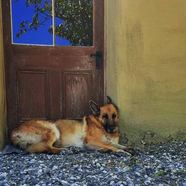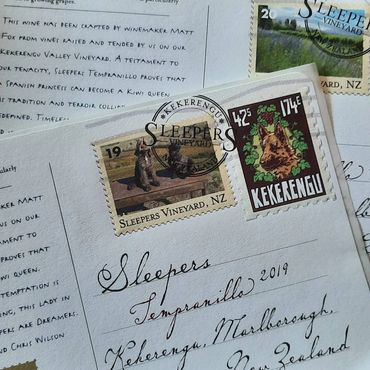 Xuxa is our German Shepherd. We made her our Tempranillo stamp because she is by Lynne's side every day. The loyalty and devotion she has is the same as our passion for growing our Tempranillo. We chose the stamp to be like the Queen of England's penny stamp because at the end of the day she is the boss. Buy here with online sales or at our cellar door.